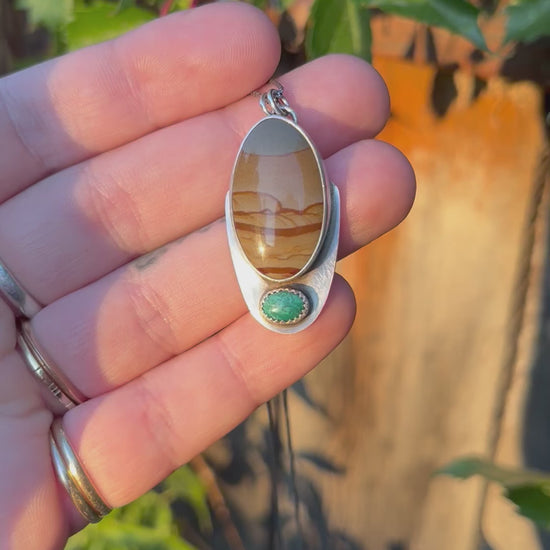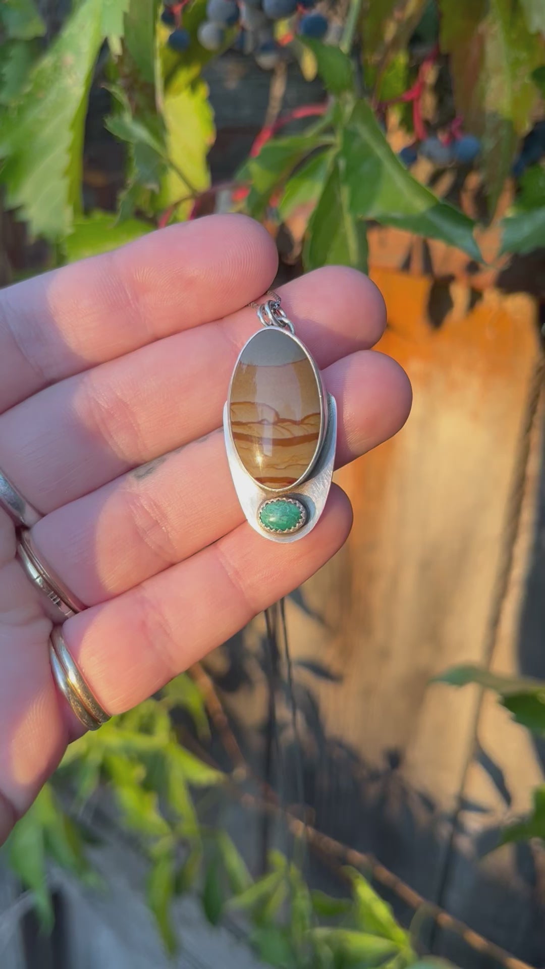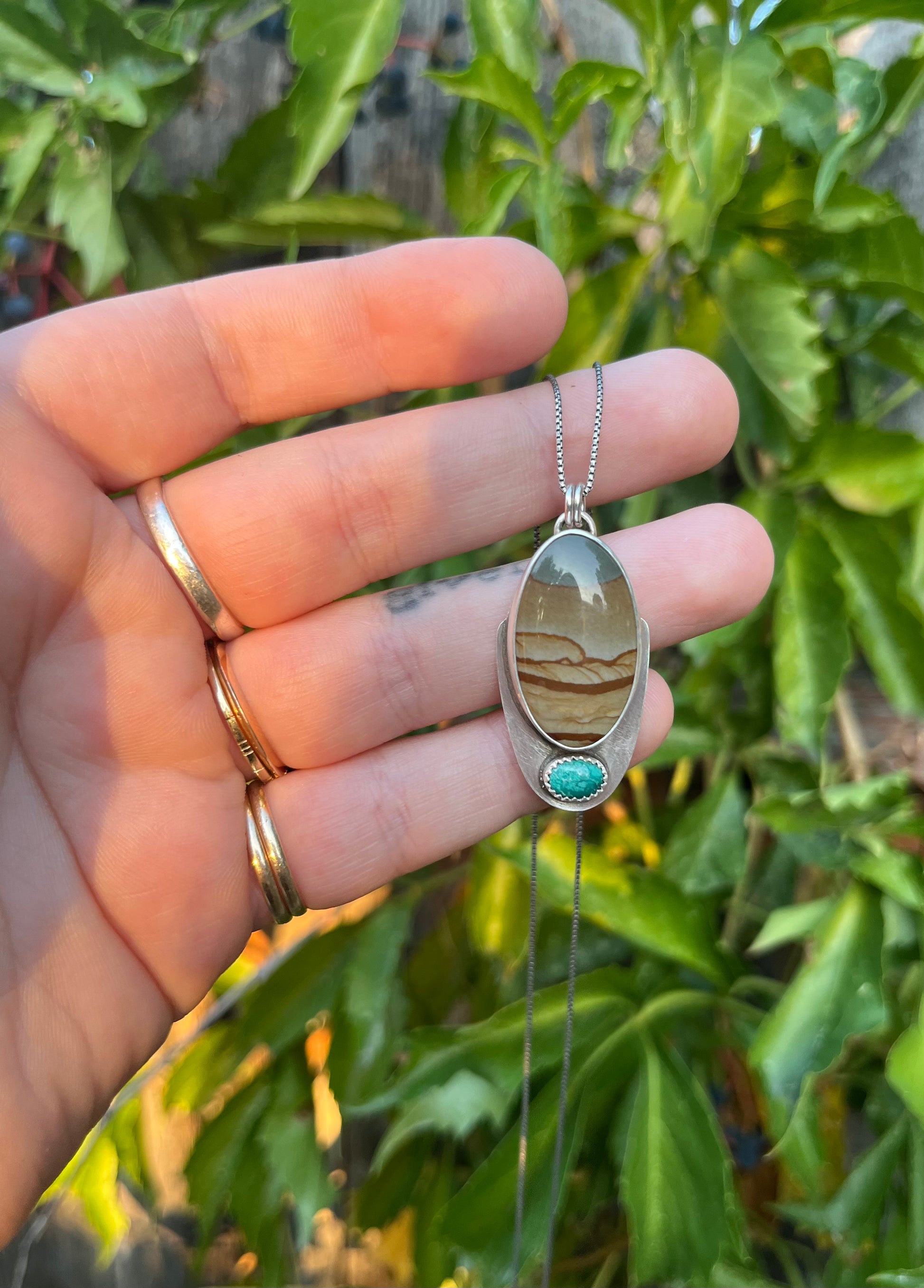 A landscape Jasper and Mexican turquoise hung on a 20 inch silver box chain.