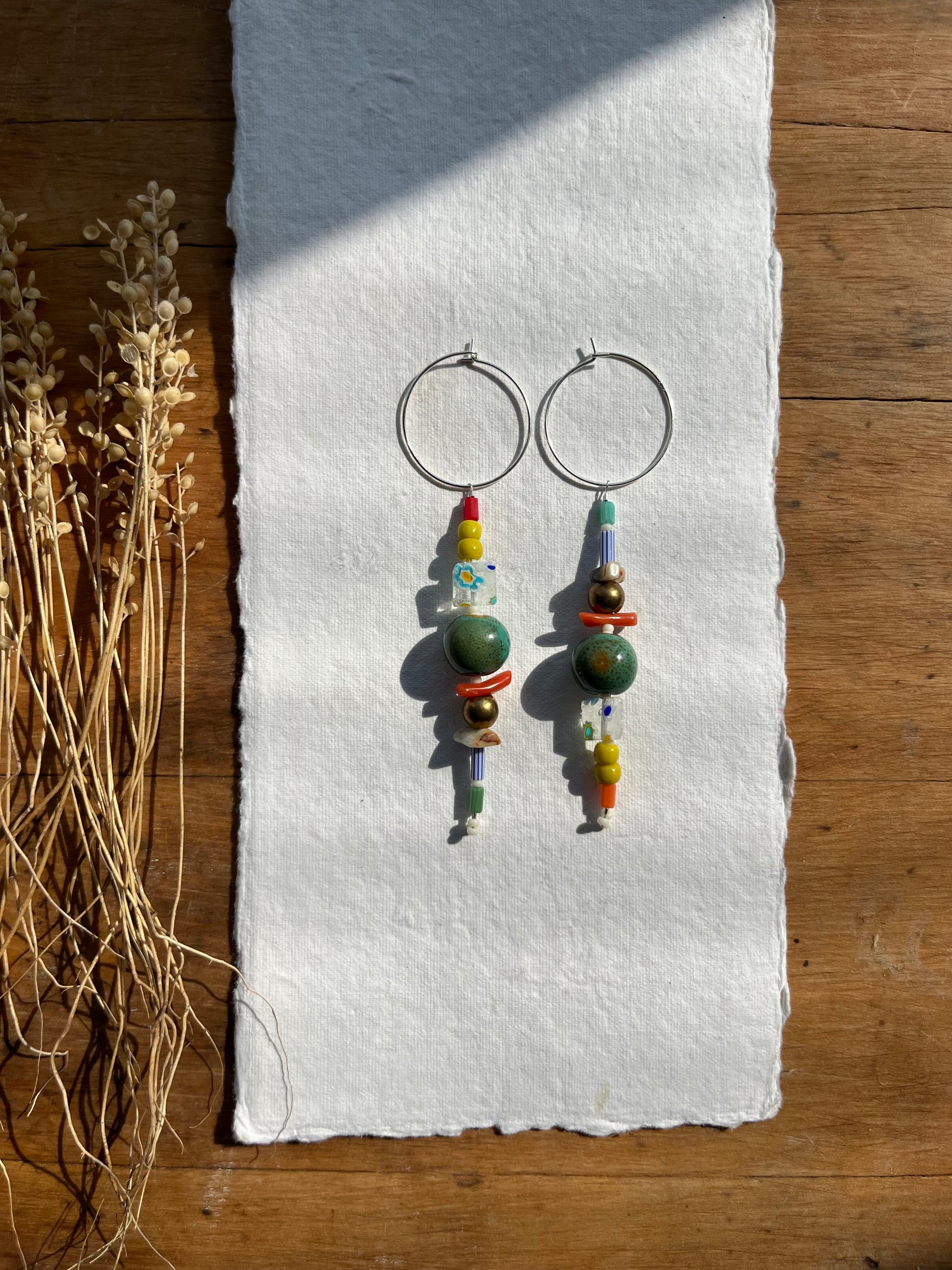 Sterling silver hoops feature a suspended string of mismatched beads. These beads have been collected by me from all over the country and world. I pick up and search out beads wherever I go.