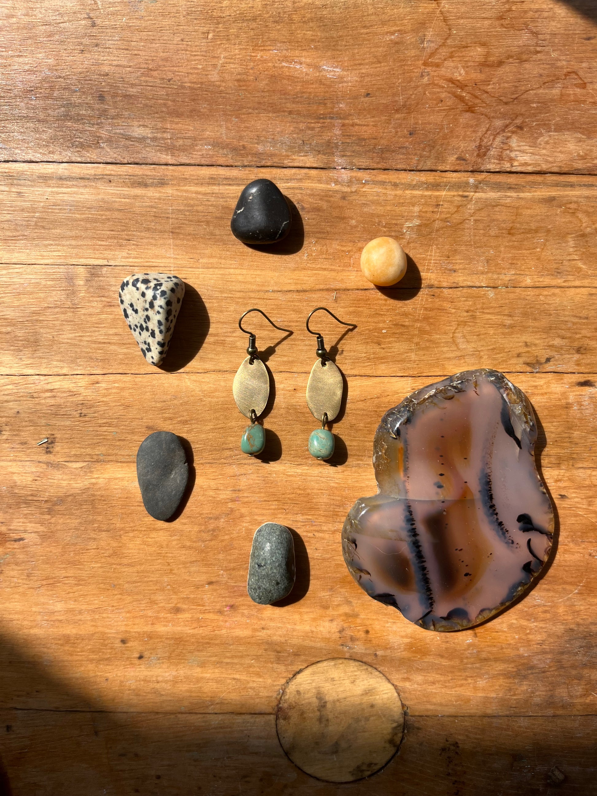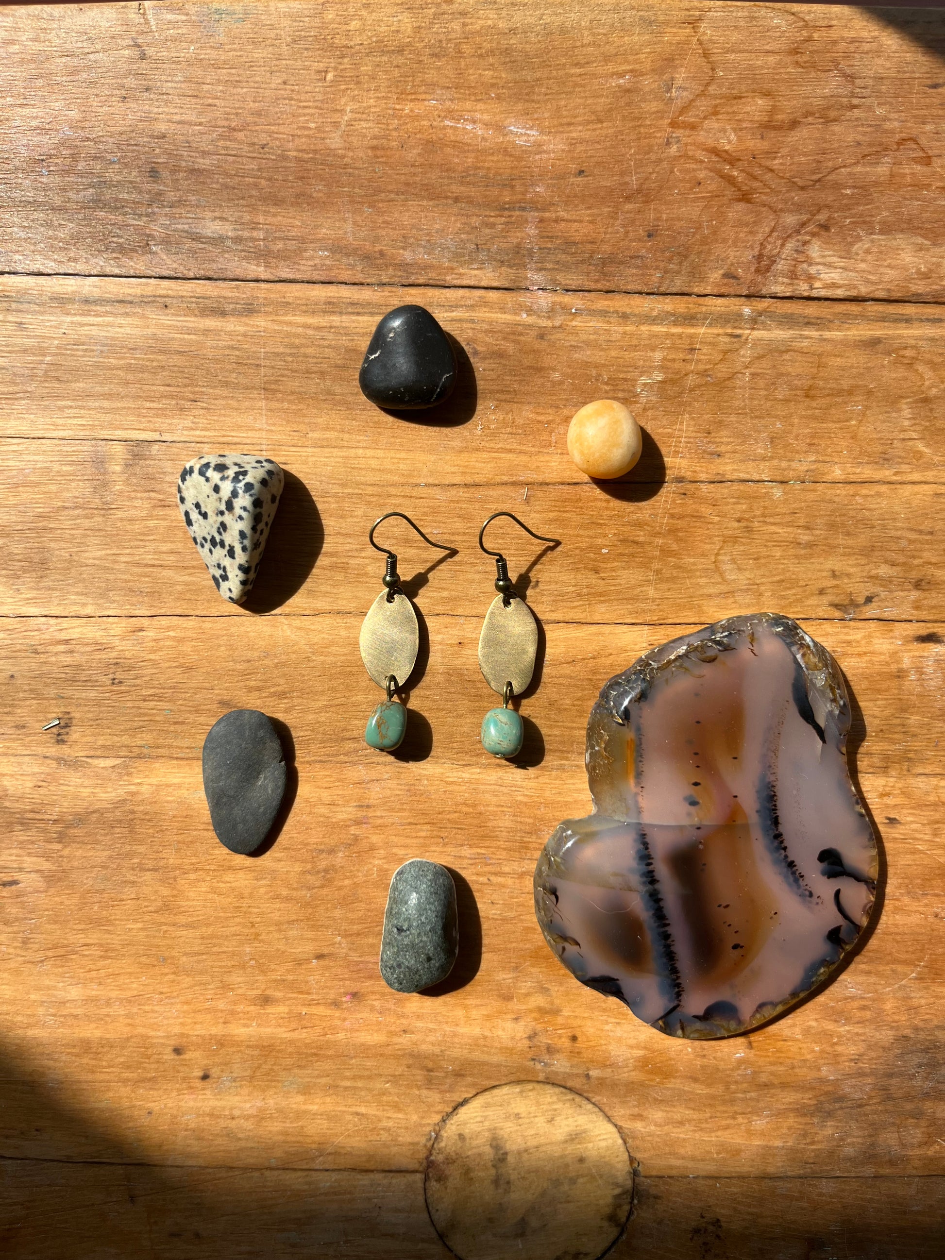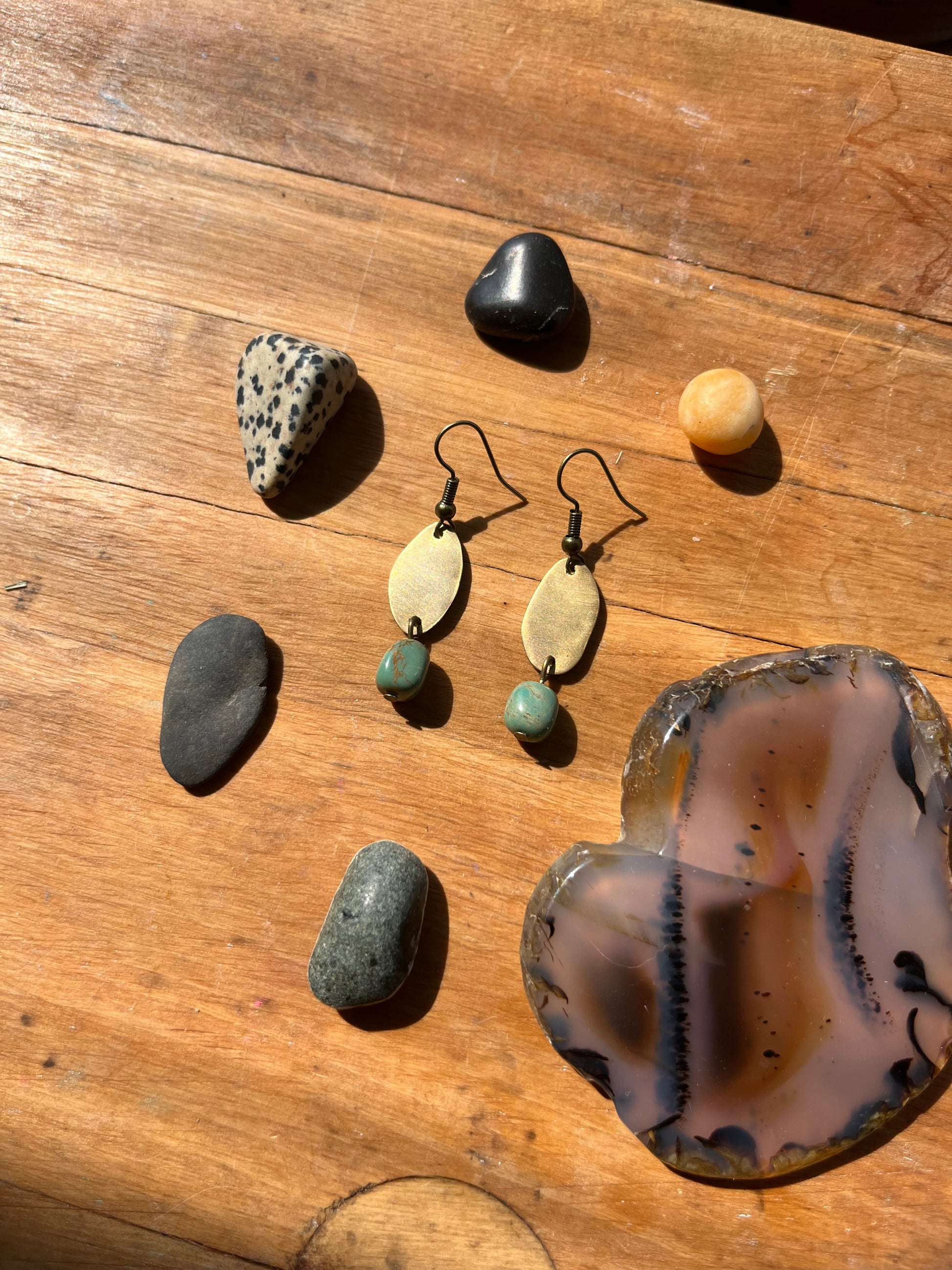 An easy 1.5 inch earring with hand cut and buffed jewelers brass and genuine turquoise beads.