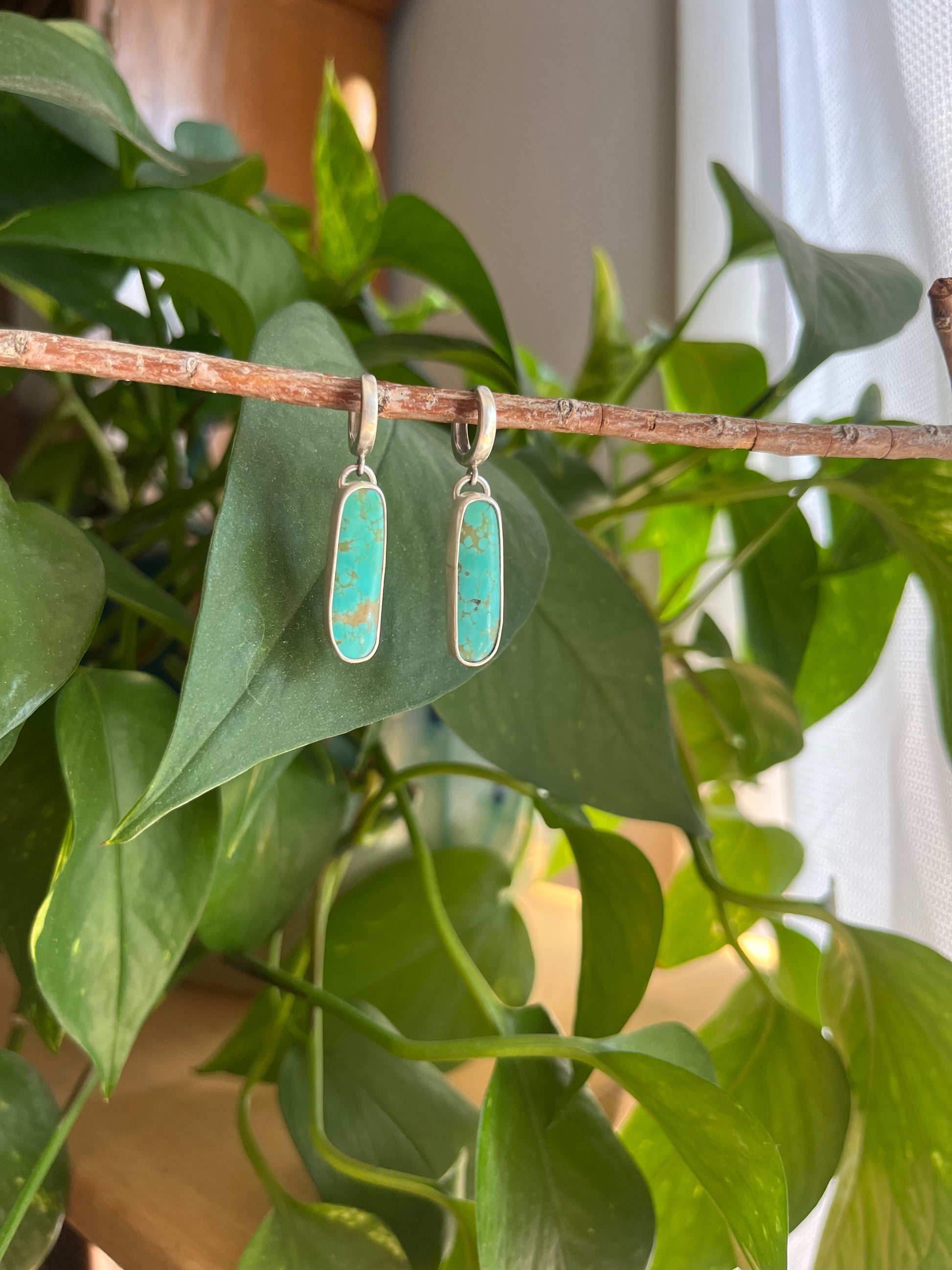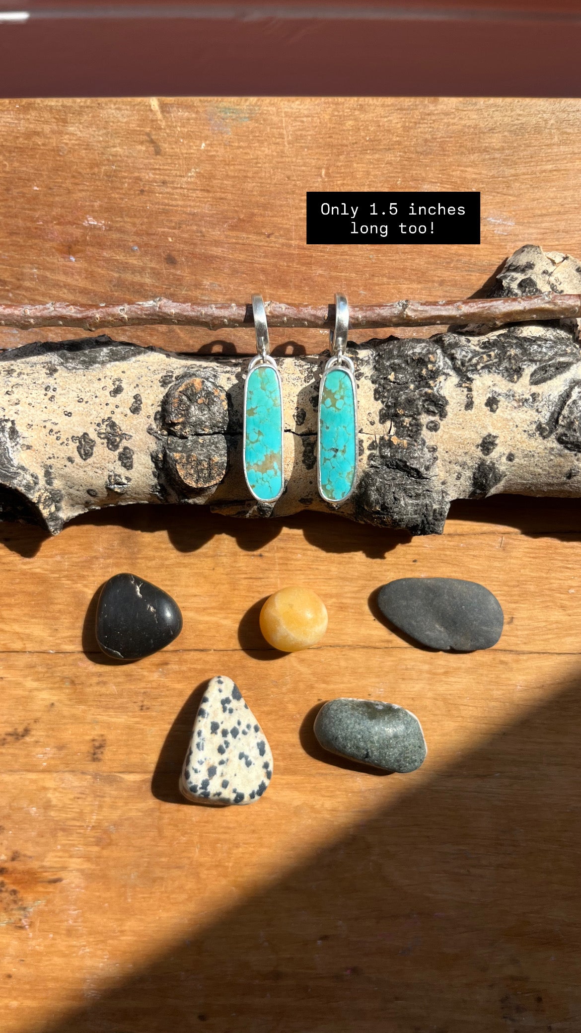 These ear huggies are made with kingman turquoise from Arizona. They are 1.5 inches long and super comfortable as well as lightweight.